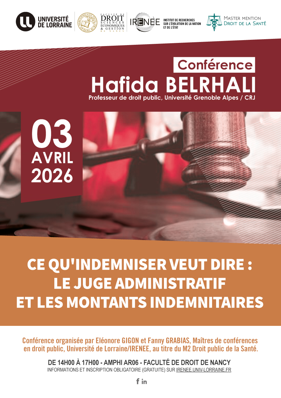 Conférence organisée par Eléonore GIGON et Fanny GRABIAS, Maîtres de conférences en droit public, Université de Lorraine/IRENEE, au titre du M2 Droit public de la Santé.