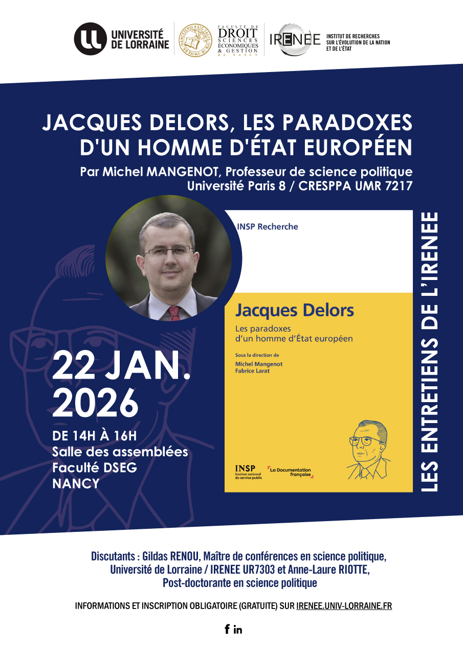 Présentation de l'ouvrage Jacques Delors, Les paradoxes d'un homme d'État européen (La documentation française, 2025), par Michel MANGENOT, Professeur de science politique, Université Paris 8 / CRESPPA UMR 7217, suivie d'une discussion avec Gildas RENOU, Maître de conférences en science politique, Université de Lorraine / IRENEE UR7303 et Anne-Laure Riotte, Post-doctorante en science politique.