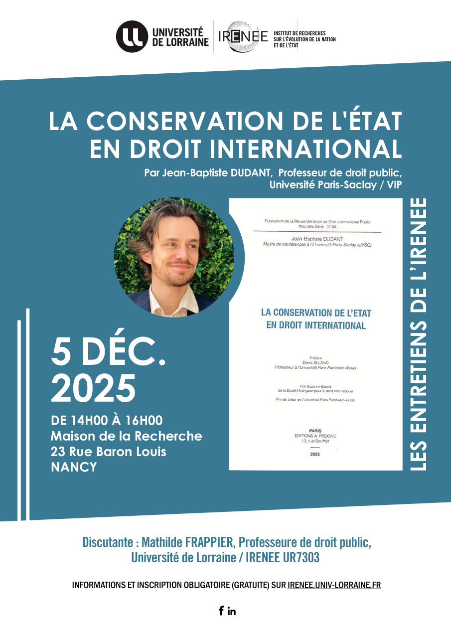 Présentation de l'ouvrage par Jean-Baptiste DUDANT, Professeur de droit public, Université Paris-Saclay / VIP. Discutante : Mathilde FRAPPIER, Professeure de droit public, Université de Lorraine / IRENEE UR7303.