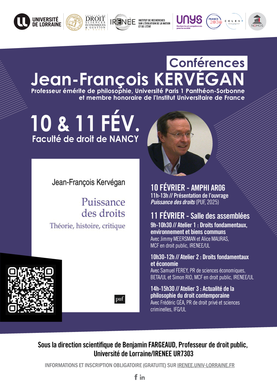 Conférence et ateliers avec Jean-François KERVÉGAN, Professeur émérite de philosophie, Université Paris 1 Panthéon-Sorbonne et membre honoraire de l'Institut Universitaire de France.